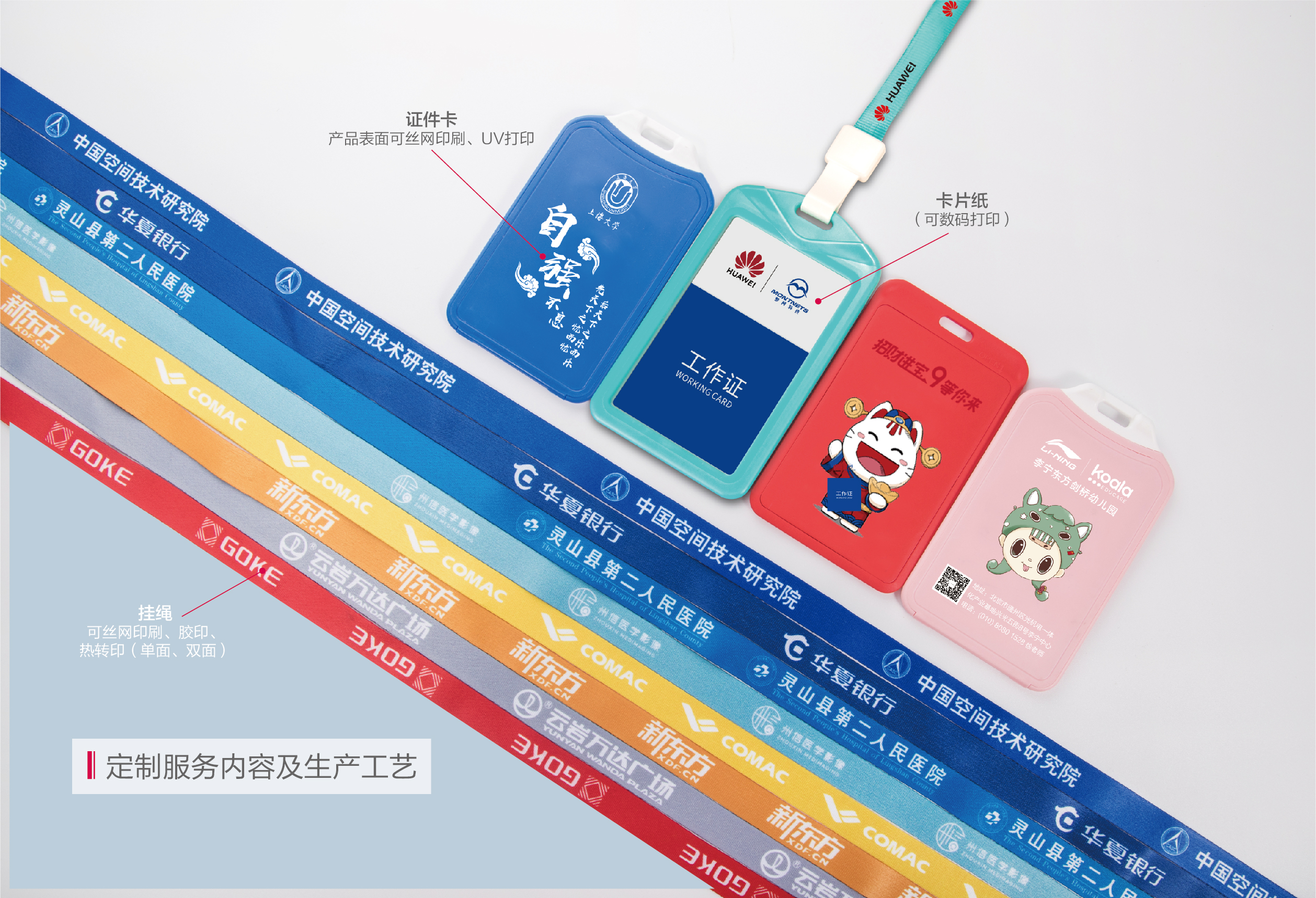 我们可以为您定制卡片纸设计及打印卡套UV,挂绳丝印和热转印、名片盒刻字、荣誉证书内页打印等。